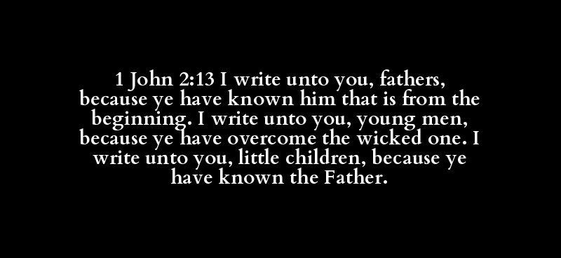1 John 2:13 I write unto you, fathers, because ye have known him that is from the beginning. I write unto you, young men, because ye have overcome the wicked one. I write unto you, little children, because ye have known the Father.