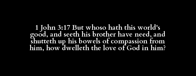 1 John 3:17 But whoso hath this world's good, and seeth his brother have need, and shutteth up his bowels of compassion from him, how dwelleth the love of God in him?
