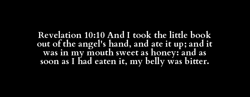 Revelation 10:10 And I took the little book out of the angel's hand, and ate it up; and it was in my mouth sweet as honey: and as soon as I had eaten it, my belly was bitter.