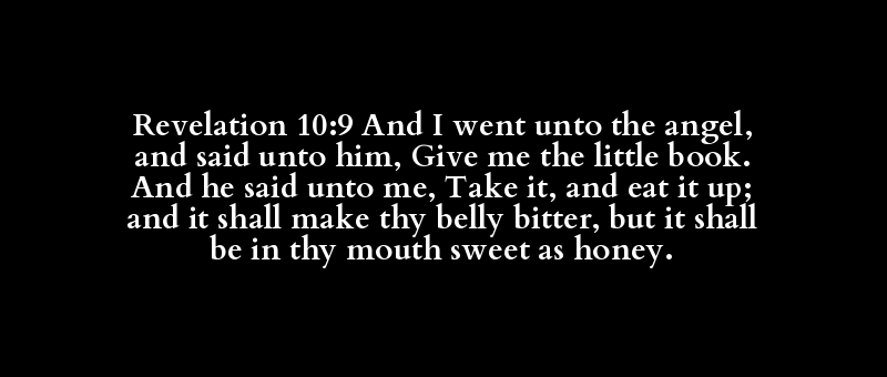 | and, also, both, but, even, for, if, o.. | come, depart, go (aside, away, back, o.. | about, according to , against, among, .. | angel, messenger | ask, bid, boast, call, describe, give .. | her, it(-self), one, the other, (mine).. | adventure, bestow, bring forth, commit.. | I, me, mine, my | little book | and, also, both, but, even, for, if, o.. | ask, bid, boast, call, describe, give .. | I, me, mine, my | accept, + be amazed, assay, attain, br.. | and, also, both, but, even, for, if, o.. | devour | her, it(-self), one, the other, (mine).. | devour | and, also, both, but, even, for, if, o.. | be (make) bitter | X home, thee, thine (own), thou, thy | belly, womb | be (make) bitter | and, but (even), howbeit, indeed, nay,.. | shall (should) be (have), (shall) come.. | about, after, against, + almost, X alt.. | X home, thee, thine (own), thou, thy | edge, face, mouth | sweet, fresh | about, after (that), (according) as (i.. | honey |