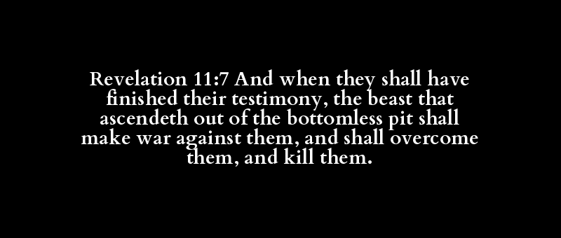 Revelation 11:7 And when they shall have finished their testimony, the beast that ascendeth out of the bottomless pit shall make war against them, and shall overcome them, and kill them.