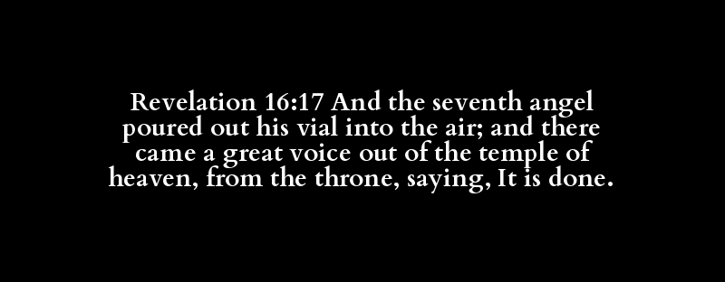 Revelation 16:17 And the seventh angel poured out his vial into the air; and there came a great voice out of the temple of heaven, from the throne, saying, It is done.