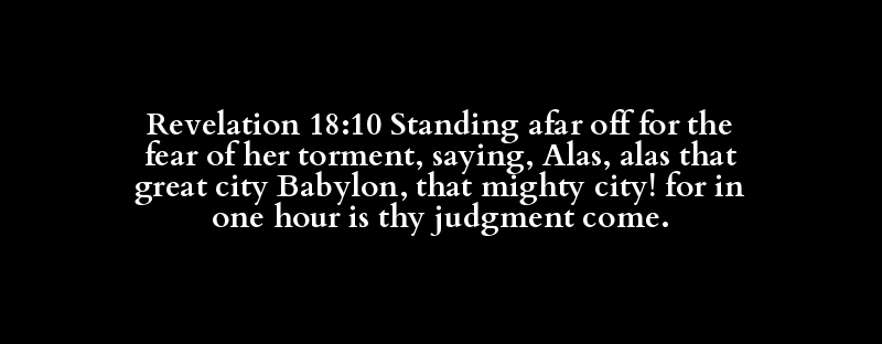 Revelation 18:10 Standing afar off for the fear of her torment, saying, Alas, alas that great city Babylon, that mighty city! for in one hour is thy judgment come.