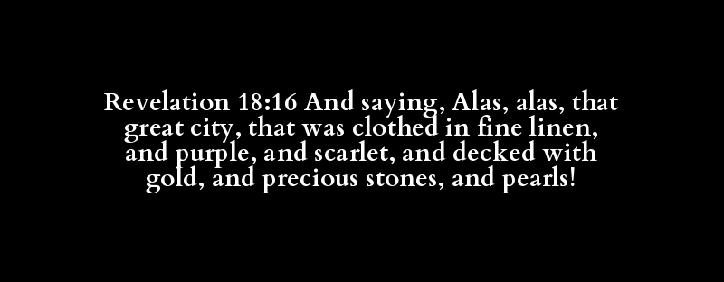 Revelation 18:16 And saying, Alas, alas, that great city, that was clothed in fine linen, and purple, and scarlet, and decked with gold, and precious stones, and pearls!