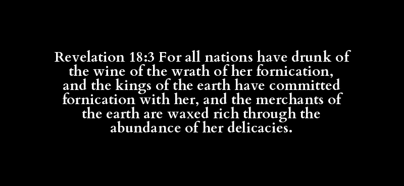Revelation 18:3 For all nations have drunk of the wine of the wrath of her fornication, and the kings of the earth have committed fornication with her, and the merchants of the earth are waxed rich through the abundance of her delicacies.