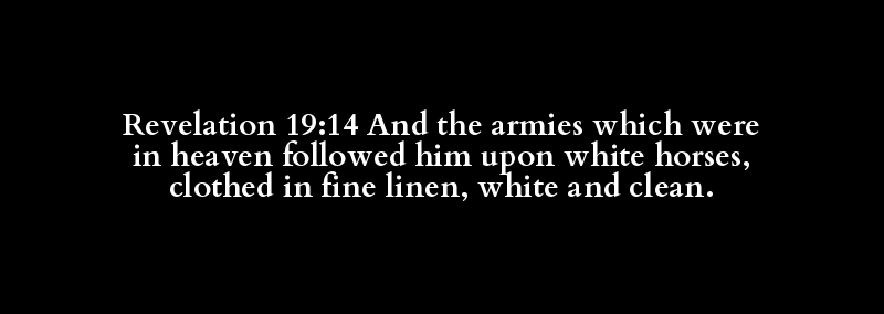 Revelation 19:14 And the armies which were in heaven followed him upon white horses, clothed in fine linen, white and clean.