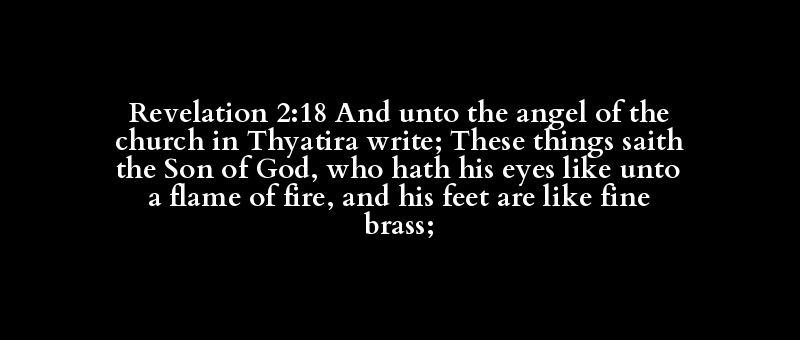 Revelation 2:18 And unto the angel of the church in Thyatira write; These things saith the Son of God, who hath his eyes like unto a flame of fire, and his feet are like fine brass;