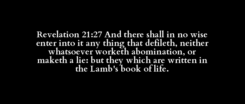 Revelation 21:27 And there shall in no wise enter into it any thing that defileth, neither whatsoever worketh abomination, or maketh a lie: but they which are written in the Lamb's book of life.