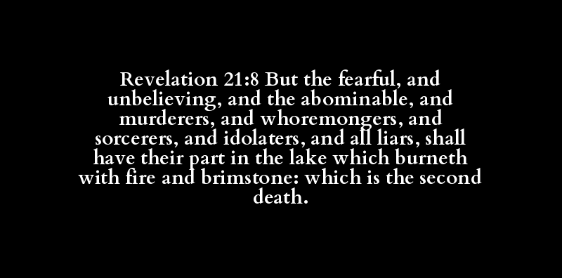 Revelation 21:8 But the fearful, and unbelieving, and the abominable, and murderers, and whoremongers, and sorcerers, and idolaters, and all liars, shall have their part in the lake which burneth with fire and brimstone: which is the second death.