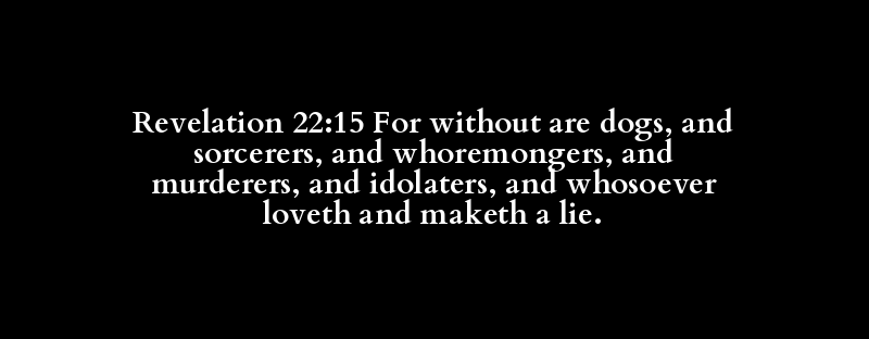 Revelation 22:15 For without are dogs, and sorcerers, and whoremongers, and murderers, and idolaters, and whosoever loveth and maketh a lie.
