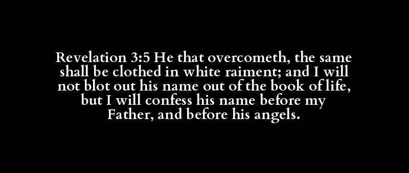 | conquer, overcome, prevail, get the vi.. | he (it was that), hereof, it, she, suc.. | array, cast about, clothe(-d me), put on | about, after, against, + almost, X alt.. | white | apparel, cloke, clothes, garment, raim.. | and, also, both, but, even, for, if, o.. | blot out, wipe away | any more, at all, by any (no) means, n.. | blot out, wipe away | her, it(-self), one, the other, (mine).. | called, (+ sur-)name(-d | after, among, X are, at, betwixt(-yond.. | book | life(-time | and, also, both, but, even, for, if, o.. | confess, profess, promise | her, it(-self), one, the other, (mine).. | called, (+ sur-)name(-d | before, in the presence (sight) of, to | I, me, mine (own), my | father, parent | and, also, both, but, even, for, if, o.. | before, in the presence (sight) of, to | her, it(-self), one, the other, (mine).. | angel, messenger |