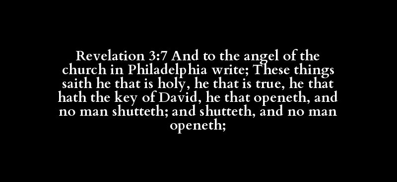 Revelation 3:7 And to the angel of the church in Philadelphia write; These things saith he that is holy, he that is true, he that hath the key of David, he that openeth, and no man shutteth; and shutteth, and no man openeth;