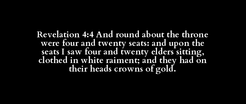 Revelation 4:4 And round about the throne were four and twenty seats: and upon the seats I saw four and twenty elders sitting, clothed in white raiment; and they had on their heads crowns of gold.