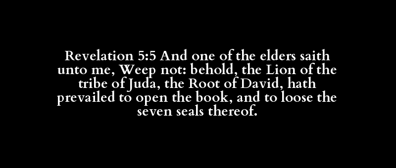 Revelation 5:5 And one of the elders saith unto me, Weep not: behold, the Lion of the tribe of Juda, the Root of David, hath prevailed to open the book, and to loose the seven seals thereof.