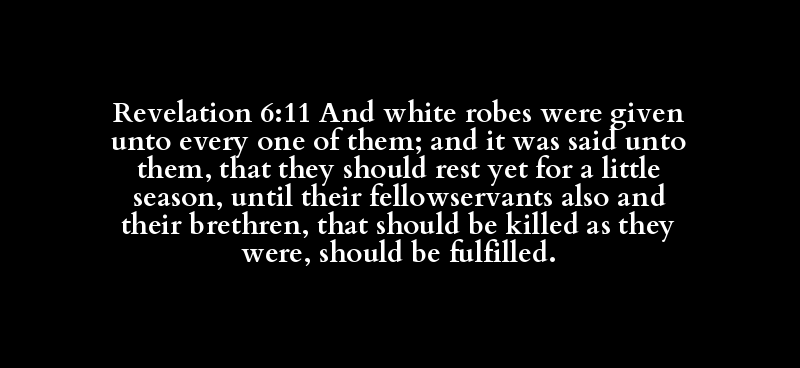 Revelation 6:11 And white robes were given unto every one of them; and it was said unto them, that they should rest yet for a little season, until their fellowservants also and their brethren, that should be killed as they were, should be fulfilled.