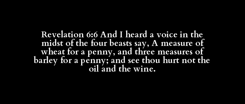 Revelation 6:6 And I heard a voice in the midst of the four beasts say, A measure of wheat for a penny, and three measures of barley for a penny; and see thou hurt not the oil and the wine.