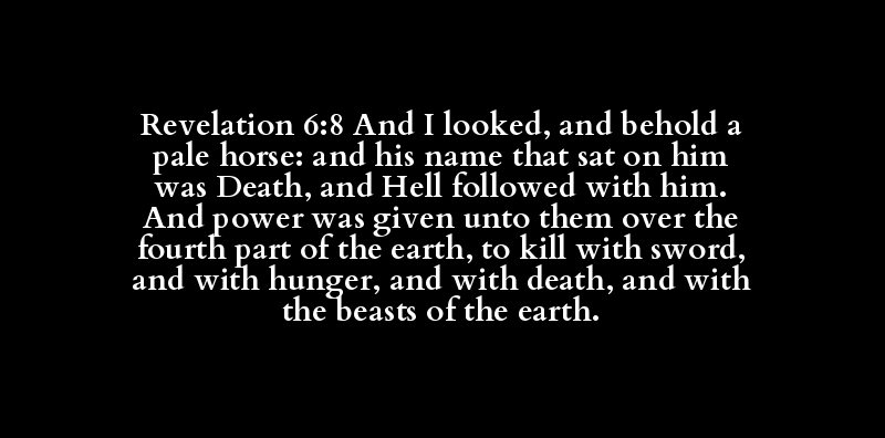 Revelation 6:8 And I looked, and behold a pale horse: and his name that sat on him was Death, and Hell followed with him. And power was given unto them over the fourth part of the earth, to kill with sword, and with hunger, and with death, and with the beasts of the earth.