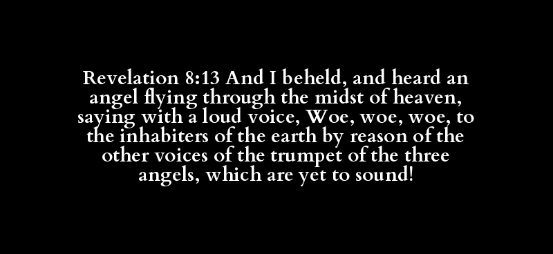 Revelation 8:13 And I beheld, and heard an angel flying through the midst of heaven, saying with a loud voice, Woe, woe, woe, to the inhabiters of the earth by reason of the other voices of the trumpet of the three angels, which are yet to sound!