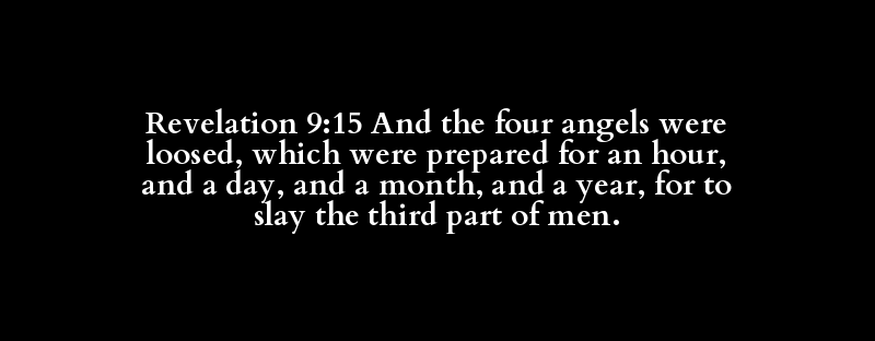 Revelation 9:15 And the four angels were loosed, which were prepared for an hour, and a day, and a month, and a year, for to slay the third part of men.