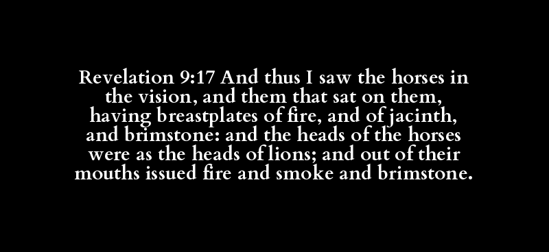 | καί | οὕτω | εἴδω | ἵππος | ἐν | ὅρασις | καί | κάθημαι | ἐπί | αὐτός | ἔχω | θώραξ | πύρινος | καί | ὑακίνθινος | καί | θειώδης | καί | κεφαλή | ἵππος | ὡς | κεφαλή | λέων | καί | ἐκ | αὐτός | στόμα | ἐκπορεύομαι | πῦρ | καί | καπνός | καί | θεῖον |