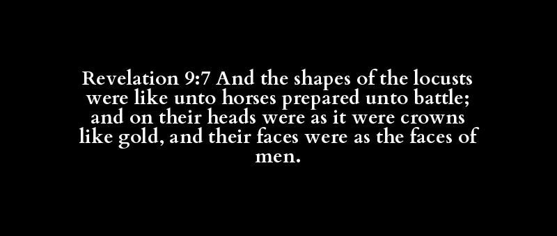 Revelation 9:7 And the shapes of the locusts were like unto horses prepared unto battle; and on their heads were as it were crowns like gold, and their faces were as the faces of men.