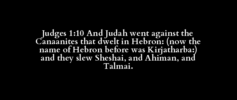 Judges 1:10 And Judah went against the Canaanites that dwelt in Hebron: (now the name of Hebron before was Kirjatharba:) and they slew Sheshai, and Ahiman, and Talmai.