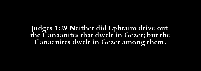 Judges 1:29 Neither did Ephraim drive out the Canaanites that dwelt in Gezer; but the Canaanites dwelt in Gezer among them.