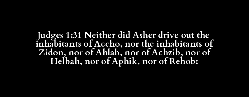 Judges 1:31 Neither did Asher drive out the inhabitants of Accho, nor the inhabitants of Zidon, nor of Ahlab, nor of Achzib, nor of Helbah, nor of Aphik, nor of Rehob: