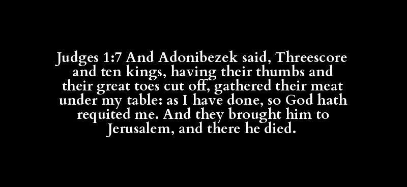 Judges 1:7 And Adonibezek said, Threescore and ten kings, having their thumbs and their great toes cut off, gathered their meat under my table: as I have done, so God hath requited me. And they brought him to Jerusalem, and there he died.