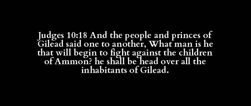 Judges 10:18 And the people and princes of Gilead said one to another, What man is he that will begin to fight against the children of Ammon? he shall be head over all the inhabitants of Gilead.