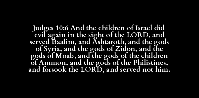 Judges 10:6 And the children of Israel did evil again in the sight of the LORD, and served Baalim, and Ashtaroth, and the gods of Syria, and the gods of Zidon, and the gods of Moab, and the gods of the children of Ammon, and the gods of the Philistines, and forsook the LORD, and served not him.