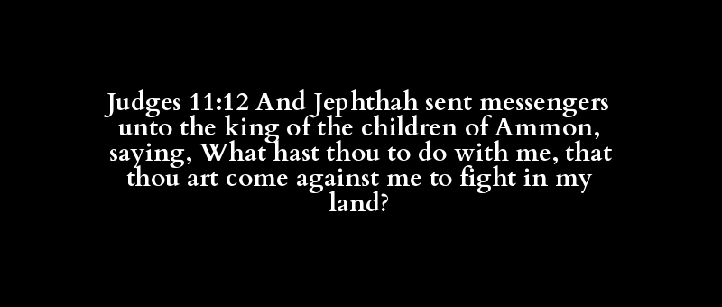 Judges 11:12 And Jephthah sent messengers unto the king of the children of Ammon, saying, What hast thou to do with me, that thou art come against me to fight in my land?