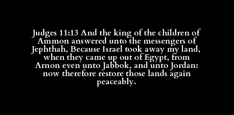 Judges 11:13 And the king of the children of Ammon answered unto the messengers of Jephthah, Because Israel took away my land, when they came up out of Egypt, from Arnon even unto Jabbok, and unto Jordan: now therefore restore those lands again peaceably.