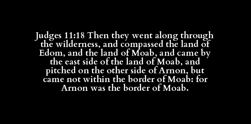 Judges 11:18 Then they went along through the wilderness, and compassed the land of Edom, and the land of Moab, and came by the east side of the land of Moab, and pitched on the other side of Arnon, but came not within the border of Moab: for Arnon was the border of Moab.