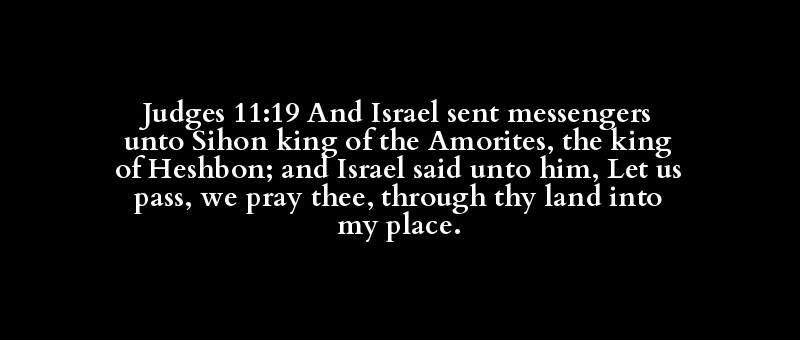 Judges 11:19 And Israel sent messengers unto Sihon king of the Amorites, the king of Heshbon; and Israel said unto him, Let us pass, we pray thee, through thy land into my place.