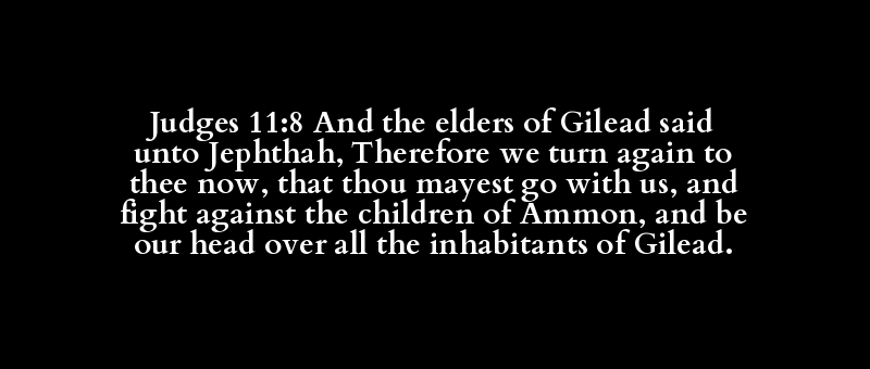 Judges 11:8 And the elders of Gilead said unto Jephthah, Therefore we turn again to thee now, that thou mayest go with us, and fight against the children of Ammon, and be our head over all the inhabitants of Gilead.