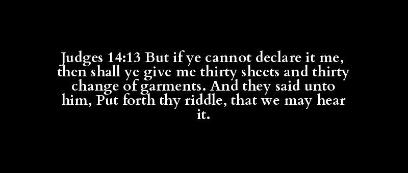 Judges 14:13 But if ye cannot declare it me, then shall ye give me thirty sheets and thirty change of garments. And they said unto him, Put forth thy riddle, that we may hear it.