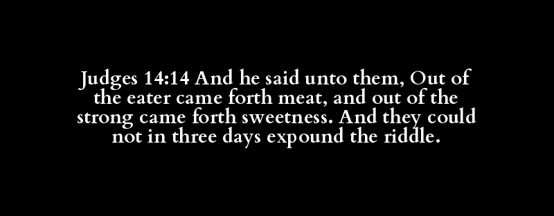 Judges 14:14 And he said unto them, Out of the eater came forth meat, and out of the strong came forth sweetness. And they could not in three days expound the riddle.