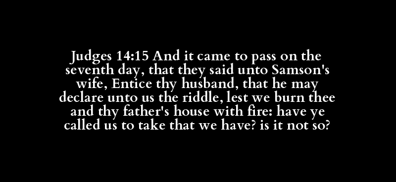 Judges 14:15 And it came to pass on the seventh day, that they said unto Samson's wife, Entice thy husband, that he may declare unto us the riddle, lest we burn thee and thy father's house with fire: have ye called us to take that we have? is it not so?
