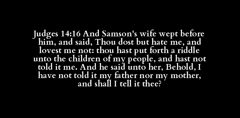 Judges 14:16 And Samson's wife wept before him, and said, Thou dost but hate me, and lovest me not: thou hast put forth a riddle unto the children of my people, and hast not told it me. And he said unto her, Behold, I have not told it my father nor my mother, and shall I tell it thee?