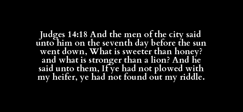 Judges 14:18 And the men of the city said unto him on the seventh day before the sun went down, What is sweeter than honey? and what is stronger than a lion? And he said unto them, If ye had not plowed with my heifer, ye had not found out my riddle.