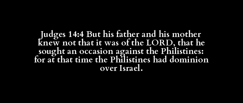 Judges 14:4 But his father and his mother knew not that it was of the LORD, that he sought an occasion against the Philistines: for at that time the Philistines had dominion over Israel.