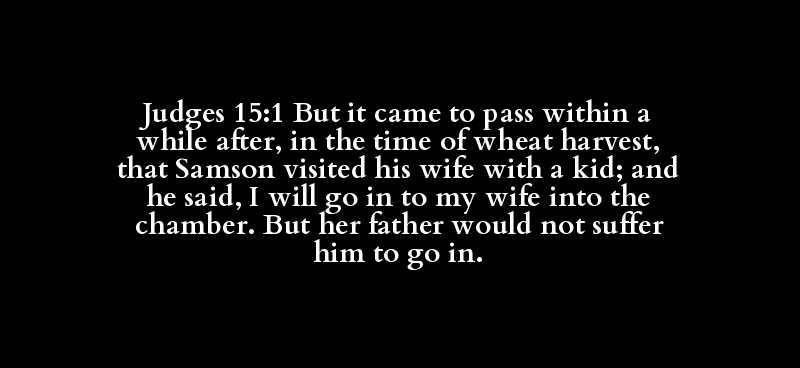 Judges 15:1 But it came to pass within a while after, in the time of wheat harvest, that Samson visited his wife with a kid; and he said, I will go in to my wife into the chamber. But her father would not suffer him to go in.