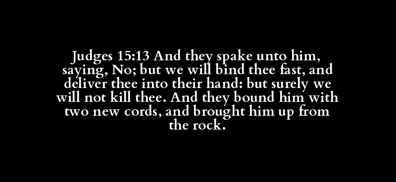 Judges 15:13 And they spake unto him, saying, No; but we will bind thee fast, and deliver thee into their hand: but surely we will not kill thee. And they bound him with two new cords, and brought him up from the rock.