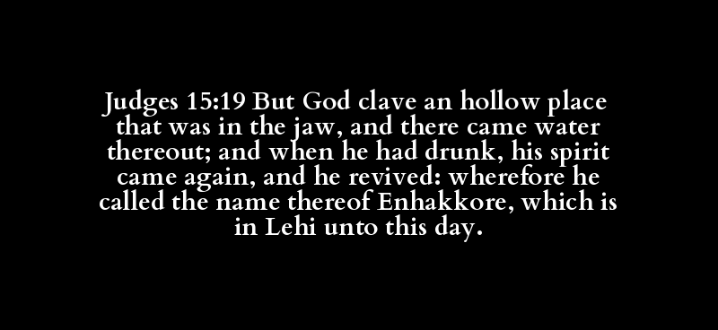 Judges 15:19 But God clave an hollow place that was in the jaw, and there came water thereout; and when he had drunk, his spirit came again, and he revived: wherefore he called the name thereof Enhakkore, which is in Lehi unto this day.