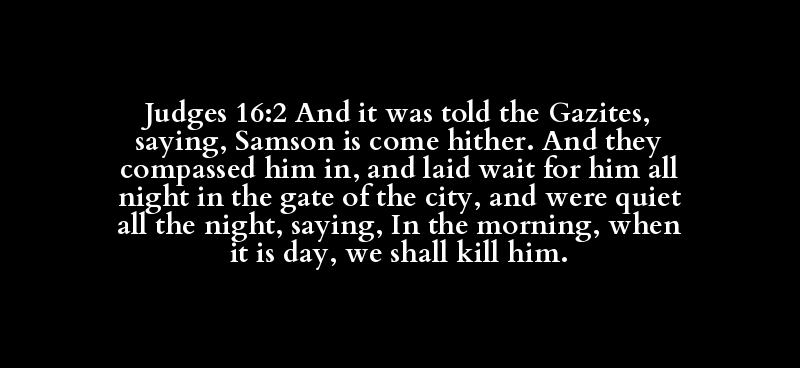 Judges 16:2 And it was told the Gazites, saying, Samson is come hither. And they compassed him in, and laid wait for him all night in the gate of the city, and were quiet all the night, saying, In the morning, when it is day, we shall kill him.