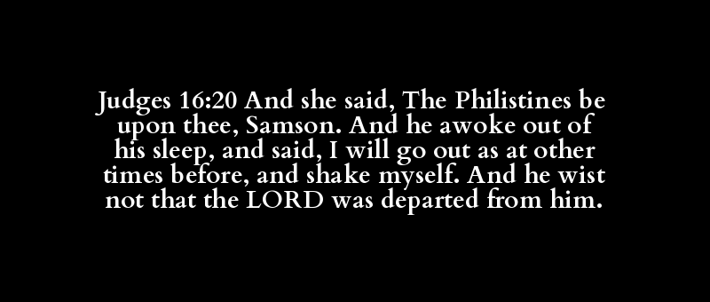 Judges 16:20 And she said, The Philistines be upon thee, Samson. And he awoke out of his sleep, and said, I will go out as at other times before, and shake myself. And he wist not that the LORD was departed from him.