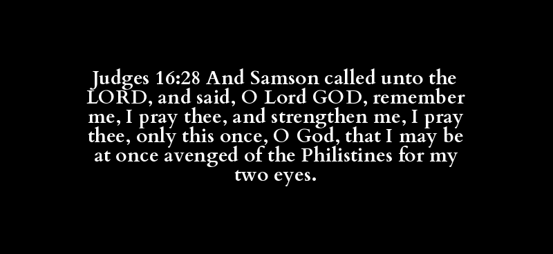 Judges 16:28 And Samson called unto the LORD, and said, O Lord GOD, remember me, I pray thee, and strengthen me, I pray thee, only this once, O God, that I may be at once avenged of the Philistines for my two eyes.