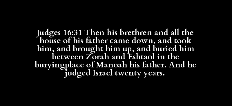 Judges 16:31 Then his brethren and all the house of his father came down, and took him, and brought him up, and buried him between Zorah and Eshtaol in the buryingplace of Manoah his father. And he judged Israel twenty years.