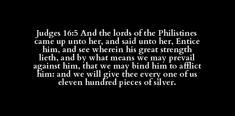 Judges 16:5 And the lords of the Philistines came up unto her, and said unto her, Entice him, and see wherein his great strength lieth, and by what means we may prevail against him, that we may bind him to afflict him: and we will give thee every one of us eleven hundred pieces of silver.